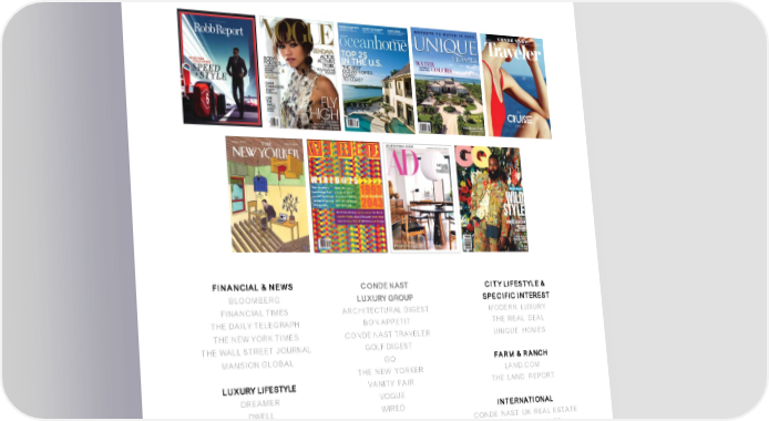 STRATEGIC MEDIA AFFILIATIONS ® From The New York Times to Condé Nast Traveler, the Coldwell Banker Global Luxury program encompassesa distinguishedportfolio of media affiliations to ensure your property’s exposure to affluent readers the world over. FINANCIAL & NEWS CONDE NAST CITY LIFESTYLE & BLOOMBERG LUXURY GROUP SPECIFIC INTEREST FINANCIAL TIMES ARCHITECTURAL DIGEST MODERN LUXURY THE DAILY TELEGRAPH BON APPETIT THE REAL DEAL THE NEW YORK TIMES CONDE NAST TRAVELER UNIQUE HOMES THE WALL STREET JOURNAL GOLF DIGEST MANSION GLOBAL GQ FARM & RANCH THE NEW YORKER LAND.COM LUXURY LIFESTYLE VANITY FAIR THE LAND REPORT DREAMER VOGUE DWELL WIRED I NTERNATIONAL ELITE TRAVELER CONDE NAST UK REAL ESTATE JAMESEDITION EQUESTRIAN HONG KONG TATLER OCEAN HOME THE CHRONICLE OF THE HORSE JUWAI ROBB REPORT EQUESTRIAN LIVING PROPGOLUXURY HORSE & RIDER SIMPLY ABU DHABI BOATING THE PLAID HORSE BOAT INTERNATIONAL PRACTICAL HORSEMAN CRUISING WORLD SAILING WORLD YACHTS & YACHTING