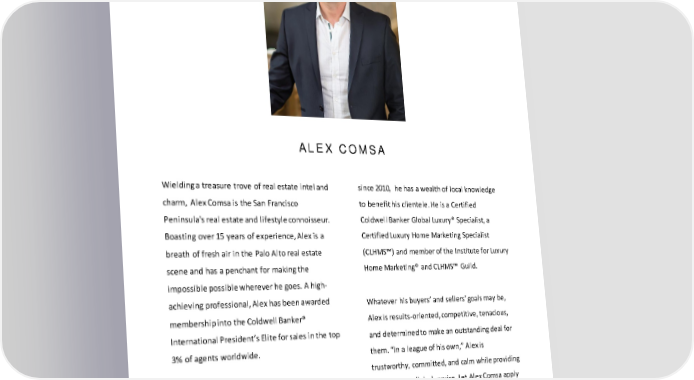 ALEX COMSA Wielding a treasure trove of real estate intel and since 2010, he has a wealth of local knowledge charm, Alex Comsa is the San Francisco to benefit his clientele. He is a Certified Peninsula's real estate and lifestyle connoisseur. ColdwellBanker Global Luxury® Specialist,a Boasting over 15 years of experience, Alex is a CertifiedLuxury Home Marketing Specialist breath of fresh air in the Palo Alto real estate (CLHMS™) and member of the Institute for Luxury scene and has a penchant for making the HomeMarketing® and CLHMS™ Guild. impossible possible wherever he goes. A high- achieving professional, Alex has been awarded Whatever his buyers’ and sellers’ goals may be, membership into the Coldwell Banker® Alex is results-oriented, competitive, tenacious, International President’s Elite for sales in the top and determined to make an outstanding deal for 3% of agents worldwide. them. “In a league of his own,” Alex is trustworthy, committed, and calm while providing Alex focuses on the luxury market of the San warm, unparalleled service. Let Alex Comsa apply Francisco Peninsula, with an emphasis on one of his real estate mastery to guide you to success in the most affluent niche markets in the country: your next real estate adventure. Iconic Palo Alto. As a resident of Palo Alto SAN FRANCISCO PENINSULA’SREAL ESTATE & LIFESTYLE CONNOISSEUR