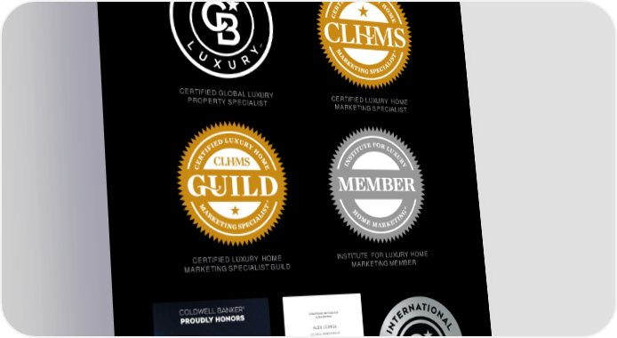 AWARDS & DESIGNATIONS CERTIFIED GLOBAL LUXURY CERTIFIED LUXURY HOME PROPERTY SPECIALIST MARKETINGSPECIALIST CERTIFIED LUXURY HOME INSTITUTE FOR LUXURY HOME MARKETING SPECIALIST GUILD MARKETING MEMBER